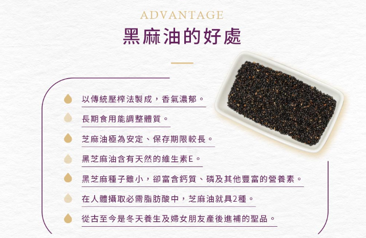 3️⃣ 黑芝麻油:100%冷压黑芝麻制成,香气浓郁,适合冬季进补与调养。