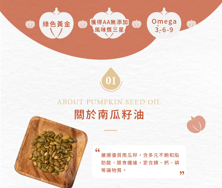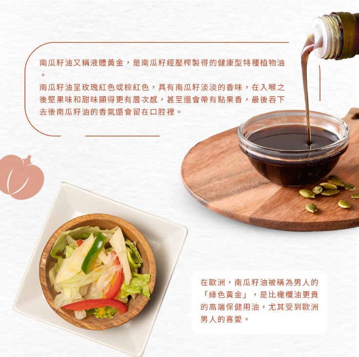 2️⃣ 南瓜籽油:坚果香气、微甜顺口,富含Omega 3、6、9与多种维生素。