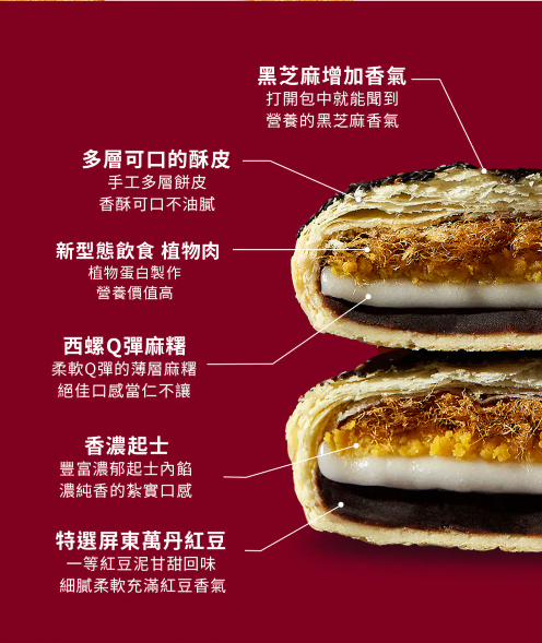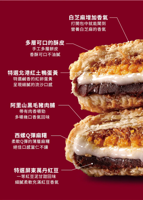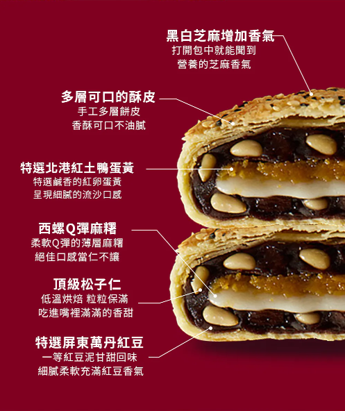 🌿严选在地食材 —— 采用台湾万丹红豆、甘蔗糖、优质芝士与松子等,保证天然原料,口感纯正。